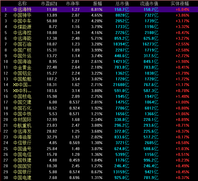 中字头个股涨幅前30名的个股,总市值最小的是中远海特150亿元,其余没有200亿以下个股,甚至500亿以下个股仅为6只,占比20%。而市值1000亿以上个股达到14只,接近半数!