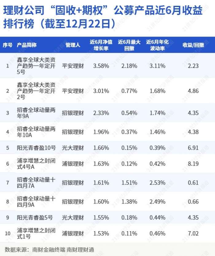 南方财经12月28日电,据南财理财通数据,截至12月22日,理财公司“固收+期权”公募理财近6月收益榜单中,配资平台4家理财公司产品上榜。