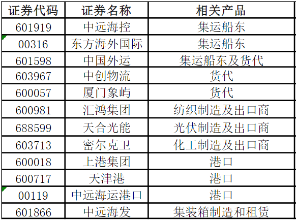 根据方正中期期货此前整理,涉及集运业的相关股票见下表: